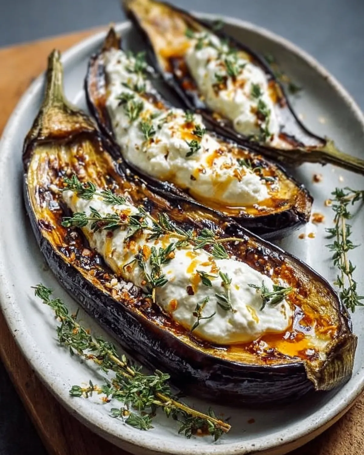 Aubergine Confite au Four, Miel et Thym, Crème de Feta Fouettée