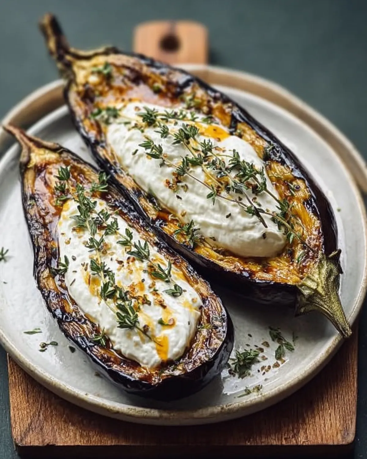 Servez les aubergines sur une assiette ou un plat de service. Ajoutez la crème de feta à la cuillère sur les aubergines chaudes. Vous pouvez aussi décorer avec quelques brins de thym frais pour une touche de couleur. Pour une présentation encore plus jolie, accompagnez le tout de quelques tranches de pain grillé.