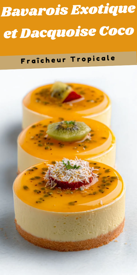 Le bavarois aux fruits exotiques est un dessert frais et léger qui allie le crémeux d’une préparation à base de lait et de crème avec des saveurs tropiques intenses. La dacquoise à la noix de coco ajoute une texture croquante et un goût de noix de coco qui complète parfaitement ce délice. Cette recette est idéale pour les chaudes journées d’été ou toute autre occasion spéciale.