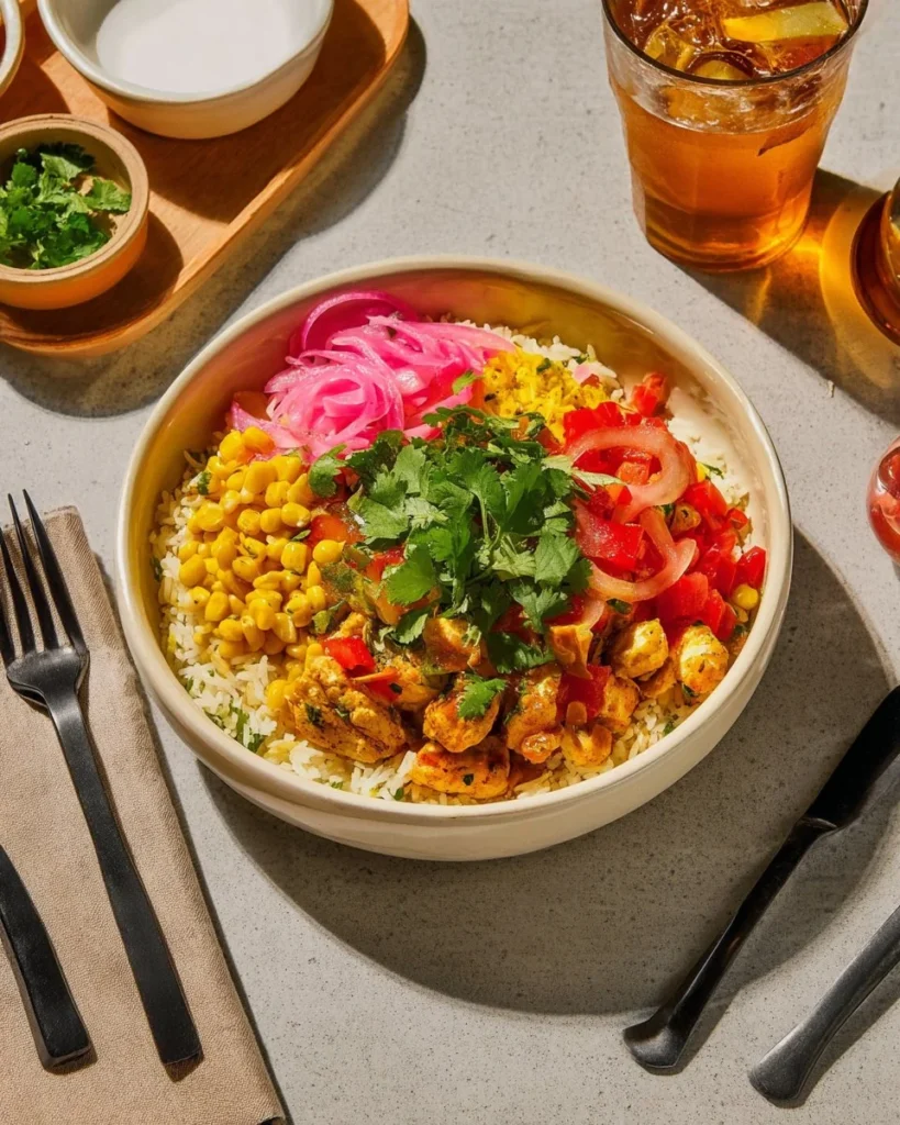 Pour une option santé, vous pouvez servir ce bol avec une petite salade verte ou des légumes grillés. Pour le contrôle des portions, veillez à ne pas trop charger vos bols, en particulier si vous suivez un régime alimentaire, comme un plan faible en calories ou en glucides. Chaque portion peut être équilibrée avec des protéines provenant du poulet et des fibres des légumes.