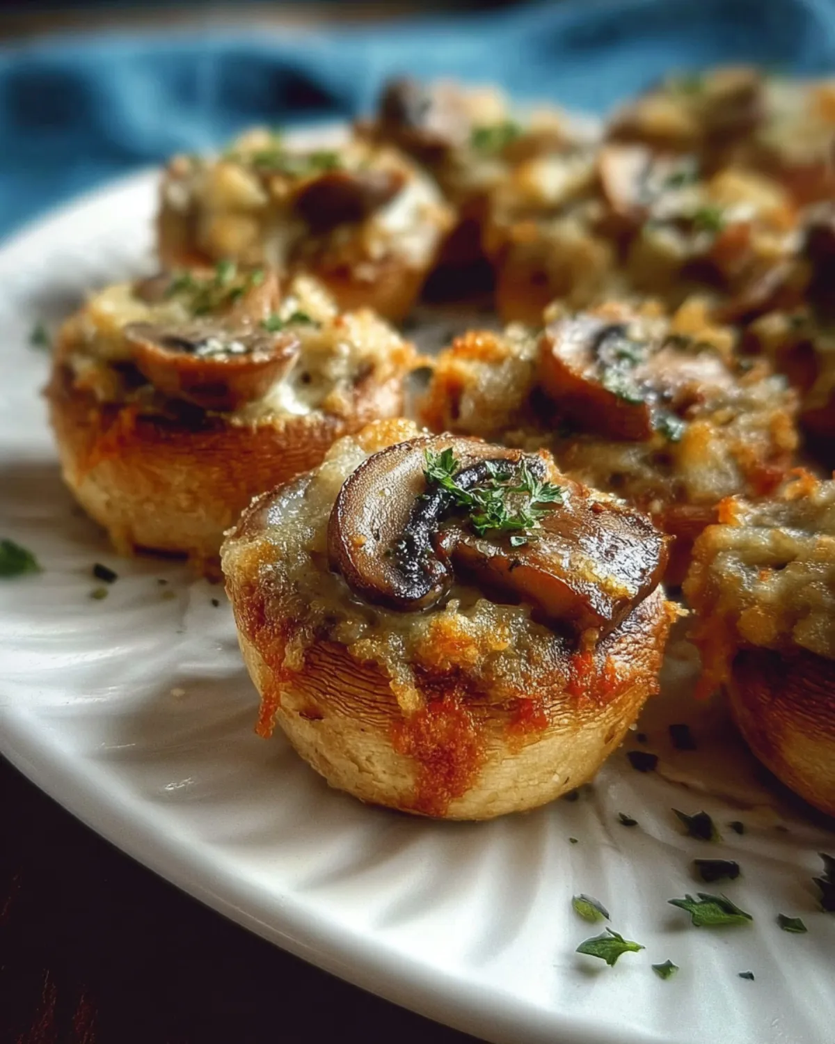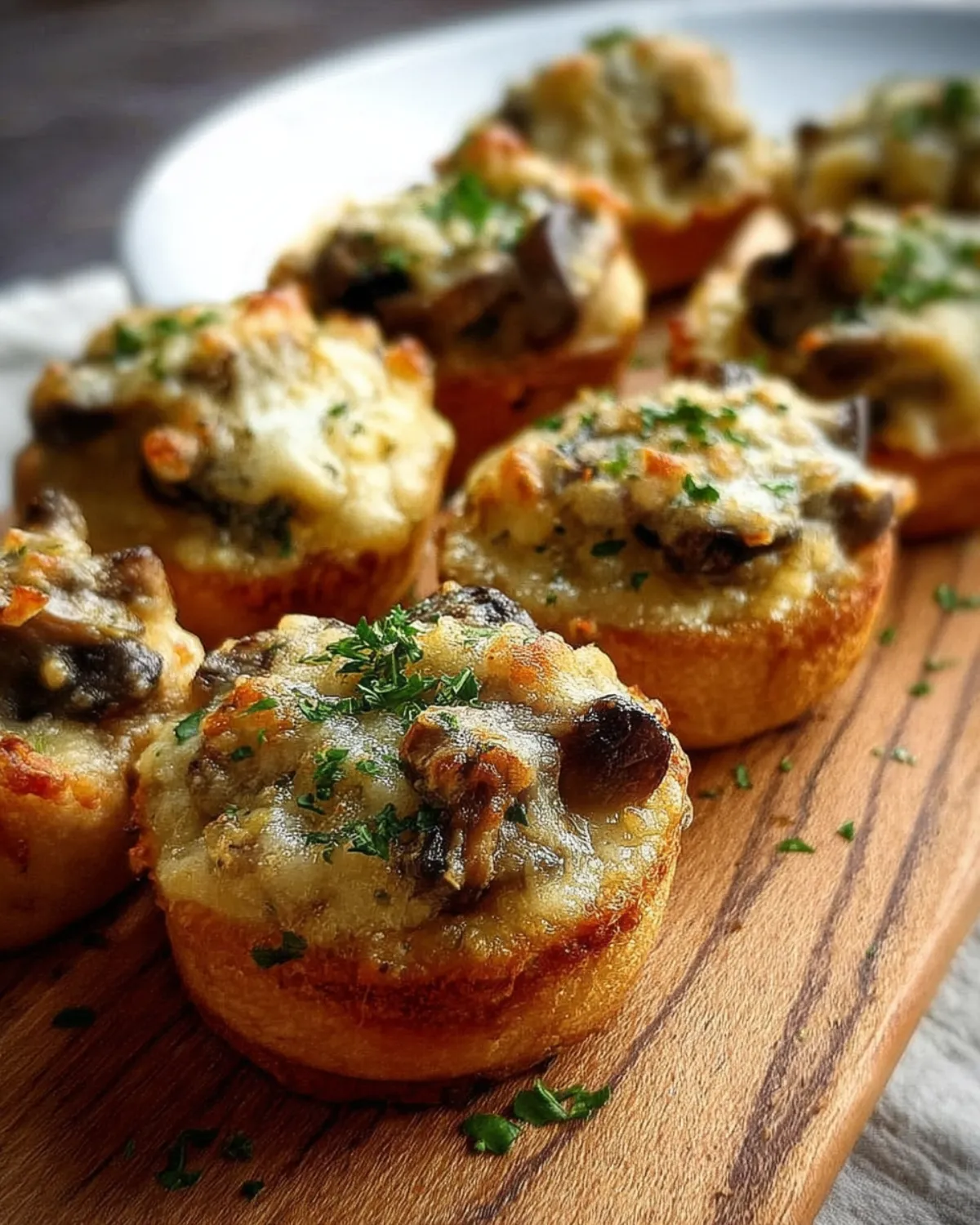 Servez les bouchées aux champignons gratinés croustillants chaudes, accompagnées d’une salade verte pour une entrée légère. Vous pouvez les présenter sur un plateau, décorer avec quelques brins de persil frais pour une touche colorée et appétissante.
