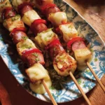 - Une fois les brochettes grillées, ajoutez les tranches de fromage sur le dessus pendant 2-3 minutes jusqu’à ce qu’elles soient fondantes.