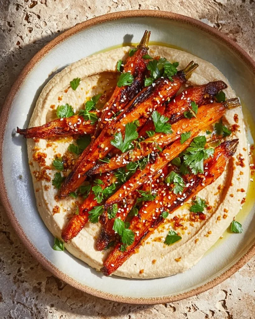 - Version riche en protéines / faible en glucides : servez les carottes rôties avec du tofu grillé, des filets de poisson ou des tranches de poulet pour en faire un high protein meal. Pour un low-carb option, réduisez la portion de houmous (ou choisissez un houmous plus léger) et accompagnez de salade verte.