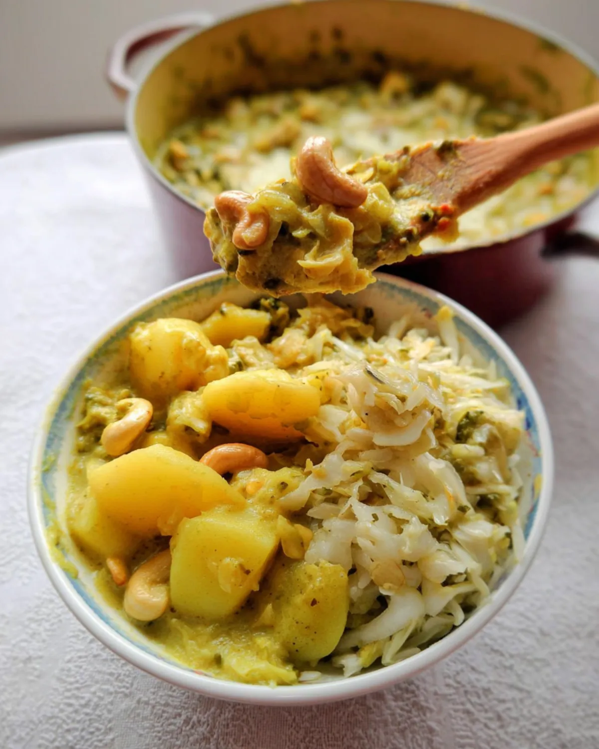 COMMENT PRÉPARER Curry of potato, green cabbage, and cashews