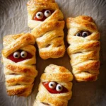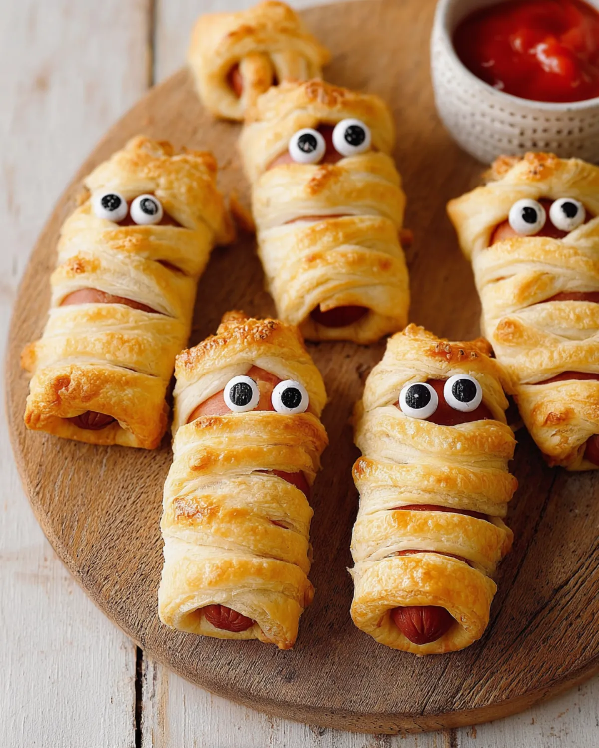 Présentez ces momies savoureuses sur un plat de service sombre pour un effet dramatique. Créez une scène avec de la sauce tomate représentant des traces de sang, et ajoutez des décorations thématiques comme des toiles d’araignée comestibles ou des herbes séchées pour évoquer les sables du désert. Servez avec différentes sauces en dip : ketchup, moutarde, ou une sauce fromagère pour plus de variété.