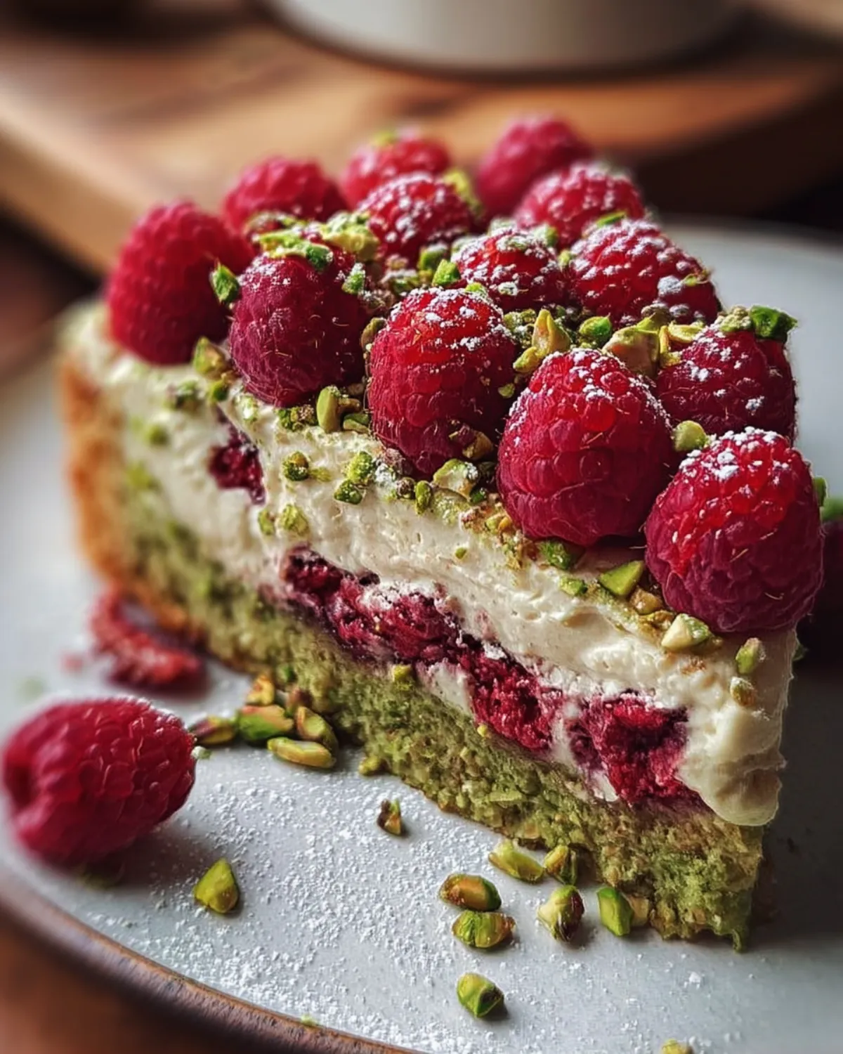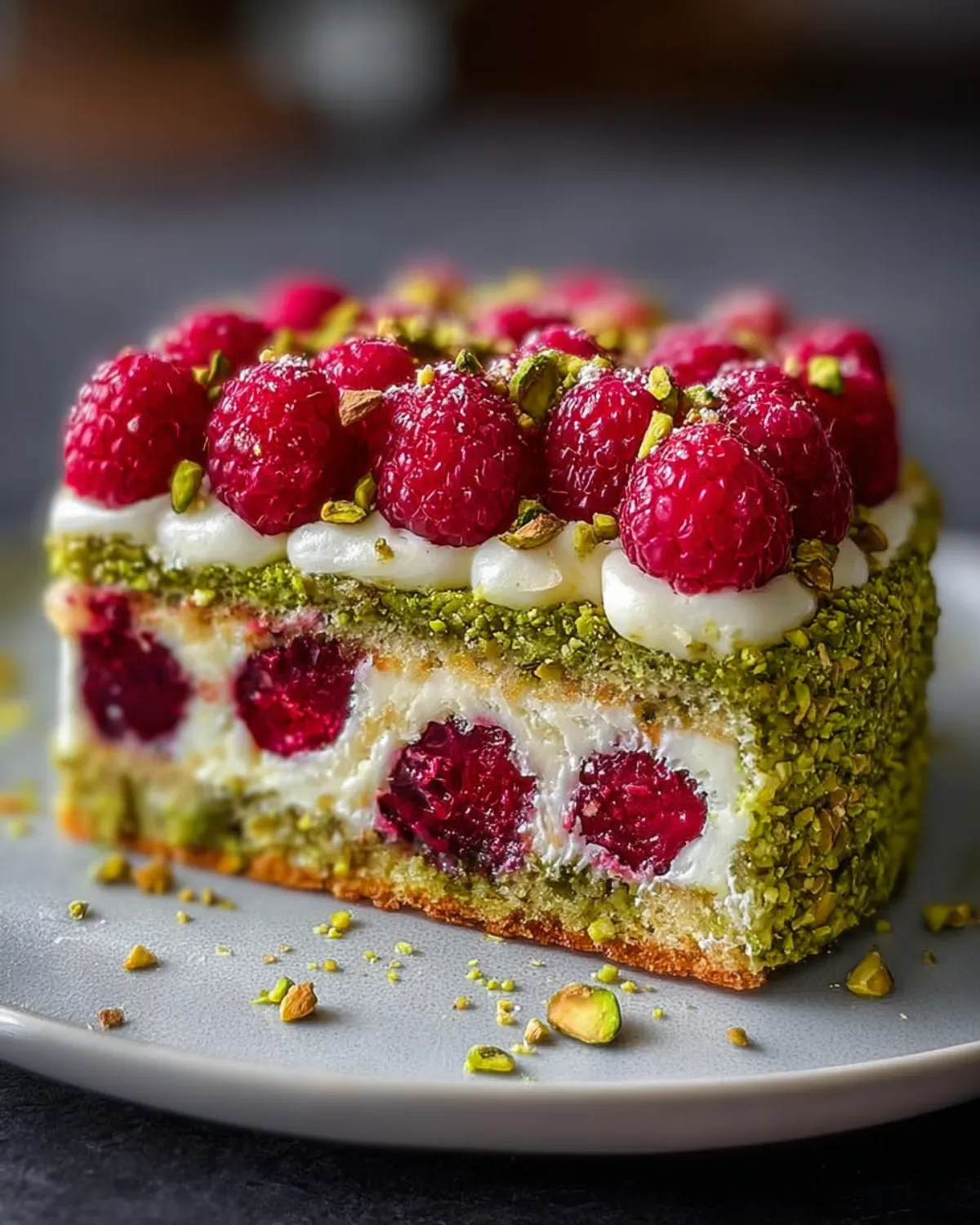 Avec ses saveurs riches et sa texture légère, le Gâteau Divin avec Pistaches et Framboises sera toujours un délice pour vos papilles. Profitez de chaque bouchée !