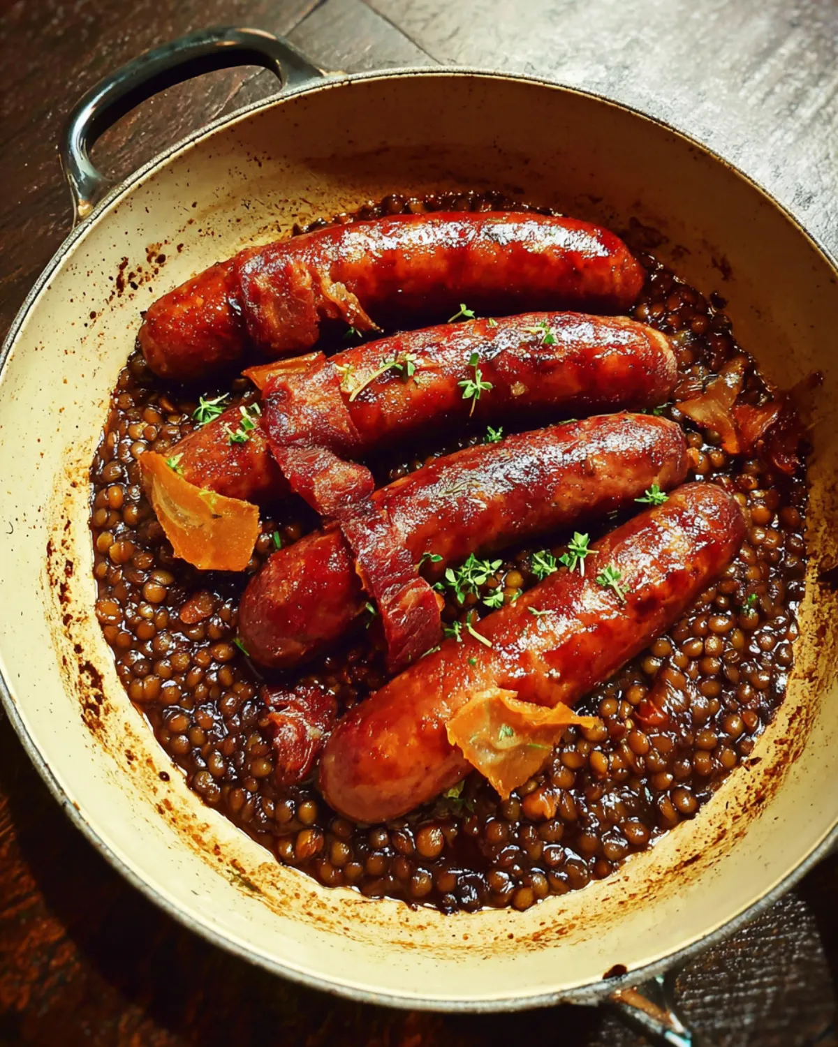 Lentils with Morteau Sausages, Smoked Bacon and Port