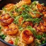 Une délicieuse poêlée de riz associe crevettes juteuses, légumes croquants et riz basmati léger pour un repas rapide et savoureux.