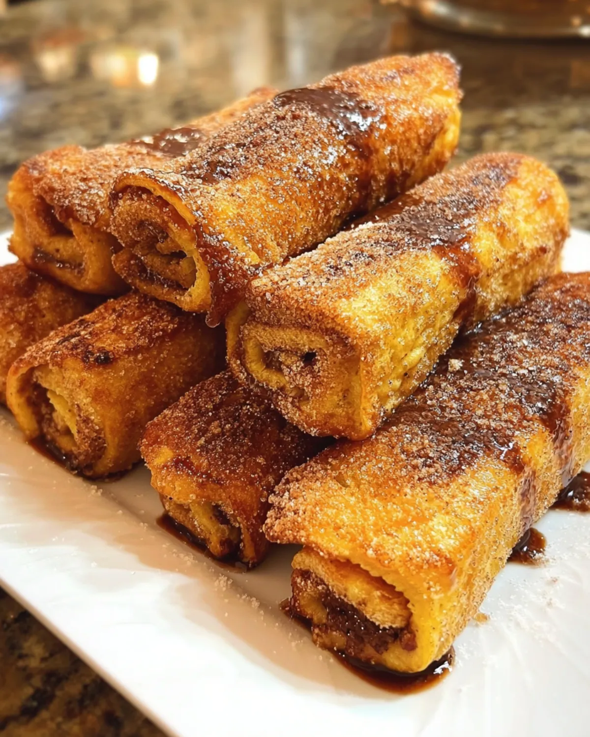 Servez les roulés façon pain perdu encore tièdes, accompagnés de fruits frais, de sirop d’érable ou de chocolat fondu. Vous pouvez également les présenter avec une boule de glace pour un dessert gourmand.