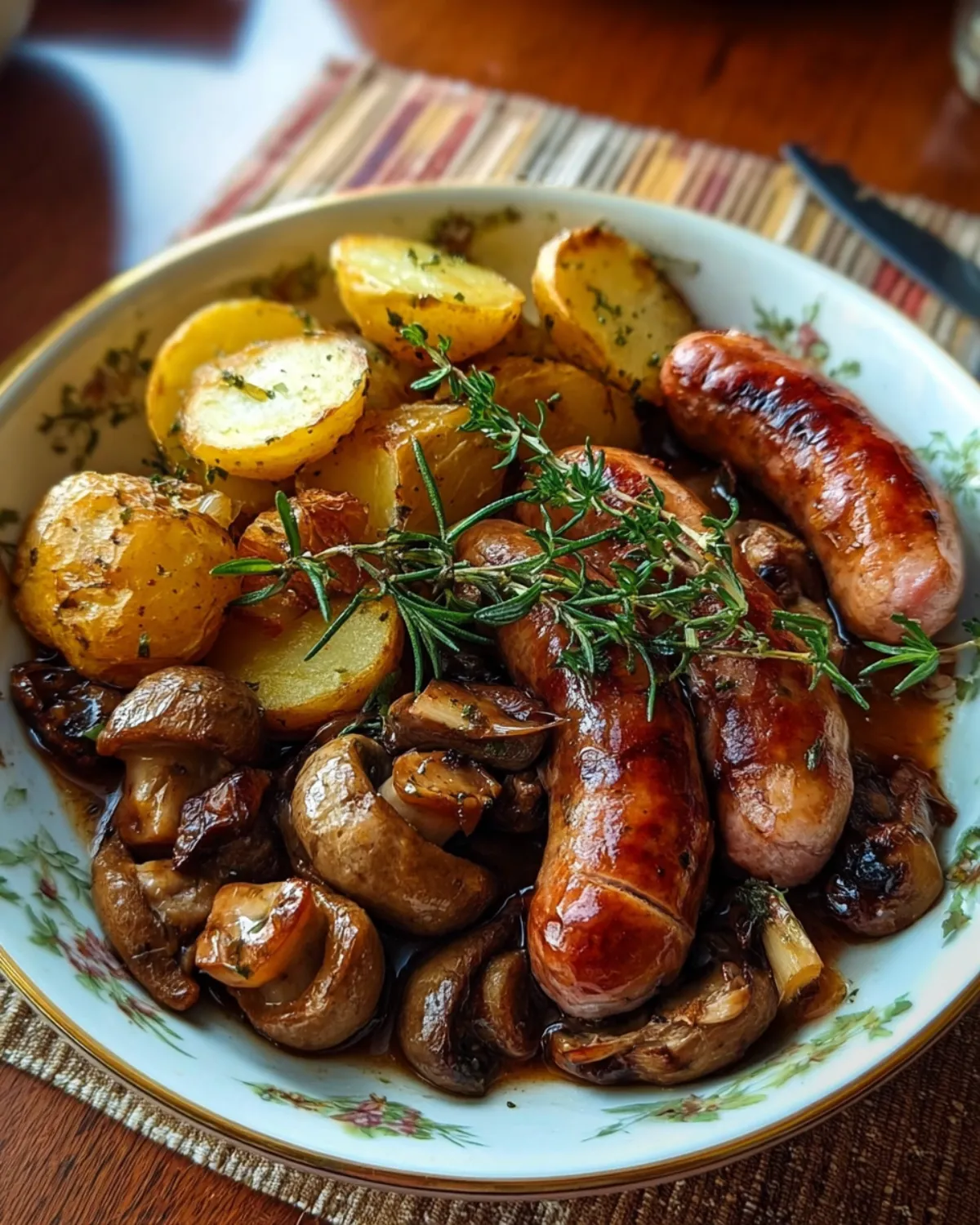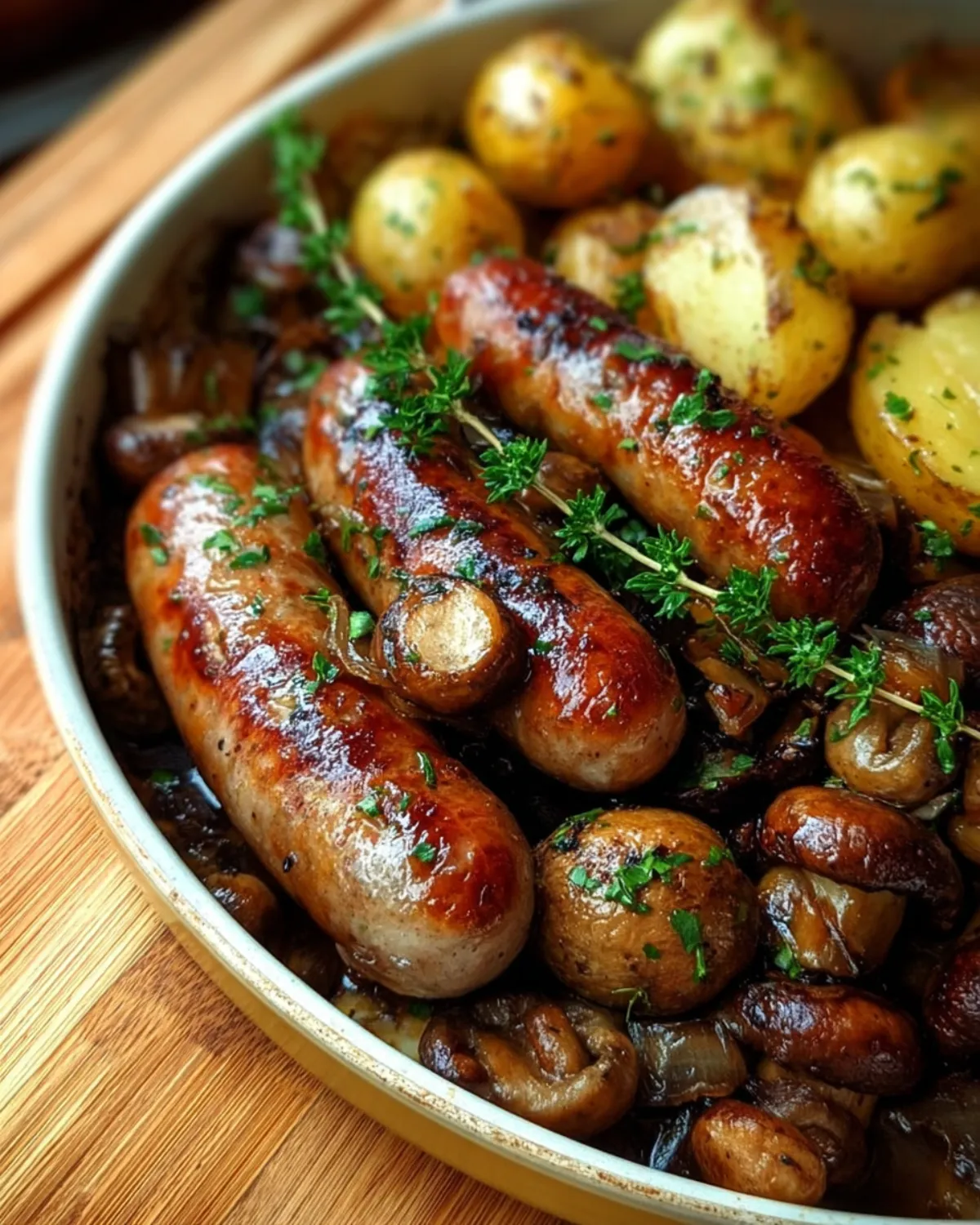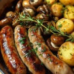 Un plat réconfortant de saucisses, champignons et pommes de terre rôti au four, parfait pour un dîner en famille.