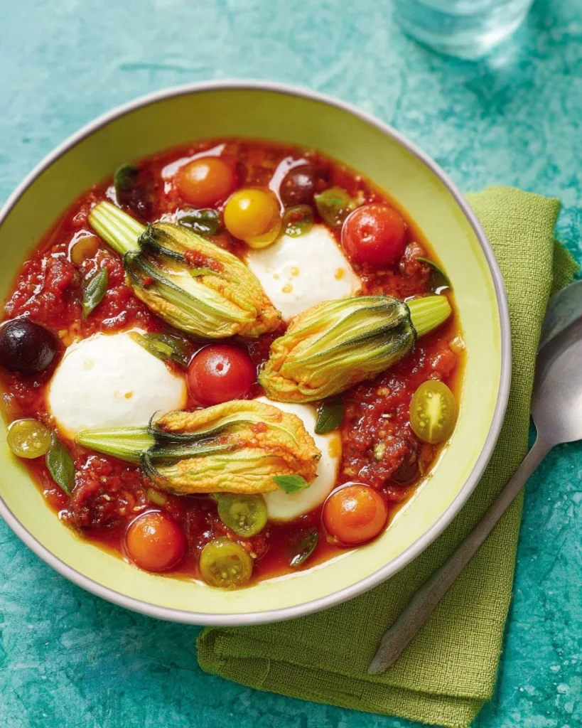 Les fleurs de courgette farcies à la Niçoise sont fraîches, parfumées et faciles à préparer. Elles combinent le goût de la mer et le goût des légumes. Cette recette vient de la cuisine méditerranéenne. Elle utilise du thon, des olives et des bocconcini. La sauce tomate est douce et simple. Vous pouvez la préparer pour un dîner ou pour un petit repas entre amis. Si vous aimez les beignets ou les courgettes, vous aimerez cette recette aussi. Pour une autre idée avec des courgettes, voyez cette recette de beignets de courgettes croustillants.