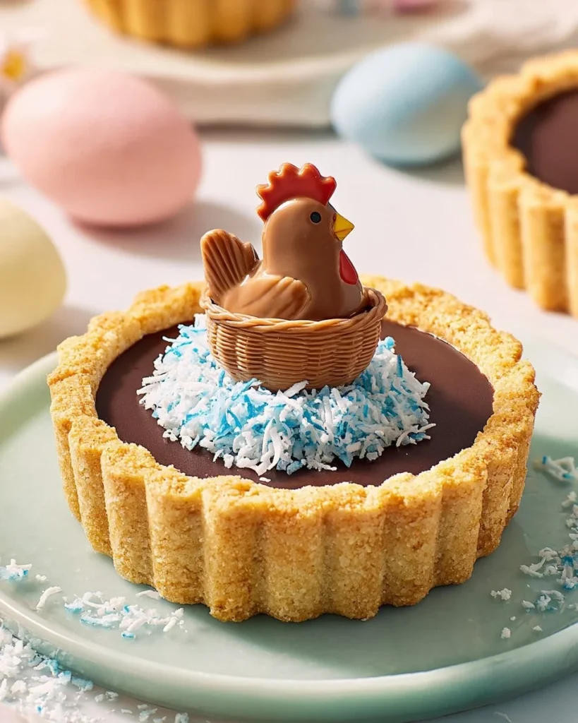- Garnissez les tartelettes de noix de coco colorée et de mini poules au chocolat.